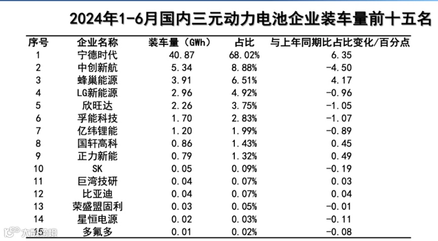 在三元动力电池方面,2024年上半年宁德时代以绝对的实力领跑全场,装车量达到40.87GWh,市占率达68.02%,而排在第二位的中创新航的市占率仅为8.88%。特别说明的是,为了实现了磷酸铁锂电池市占率的提升,比亚迪很早就把大部分精力放在了研发磷酸铁锂电池上,而在三元动力电池方面,比亚迪从5月份上榜后,于6月份跃升至第十位,装车量0.04GWh,市场占比0.38%,可以看出比亚迪正在向三元动力电池领域发起“冲击”。