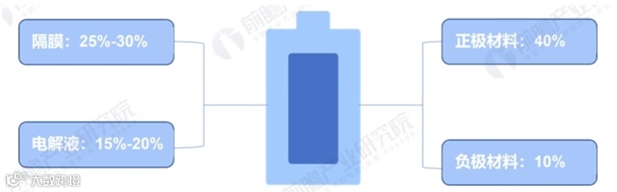 根据《锂电池新能源汽车全生命周期成本研究2023》,我国动力锂电池电芯成本构成中,正极材料占比最高,约为40%;其次是隔膜,占比为25-30%;电解液占比15%-20%;负极材料占比10%左右。
