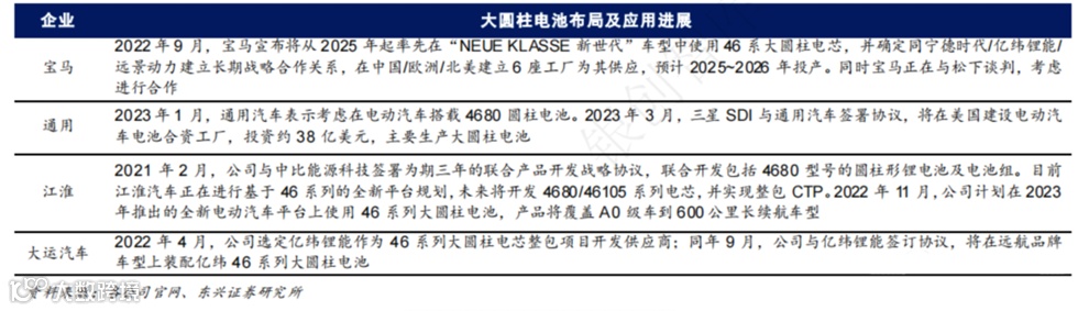 除特斯拉加速推进 4680 电池落地及大规模应用外,宝马、通用、江淮等海内外车企均已公开宣布将使用或考虑使用大圆柱电池,大圆柱电池的批量应用进程有望提速。