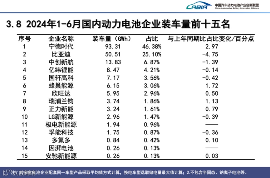 从动力电池企业装车量排名来看,2024年上半年国内动力电池企业装车量TOP15的企业分别是:宁德时代、比亚迪、中创新航、亿纬锂能、国轩高科、蜂巢能源、欣旺达、瑞浦兰钧、正力新能、LG新能源、极电新能源、孚能科技、多氟多、因湃电池、安驰新能源。其中宁德时代位列第一,装车量达到93.31GWh,占比近50%,比亚迪以50.51GWh的装车量排名第二,市占率25.1%,同比下滑4.75个百分点。