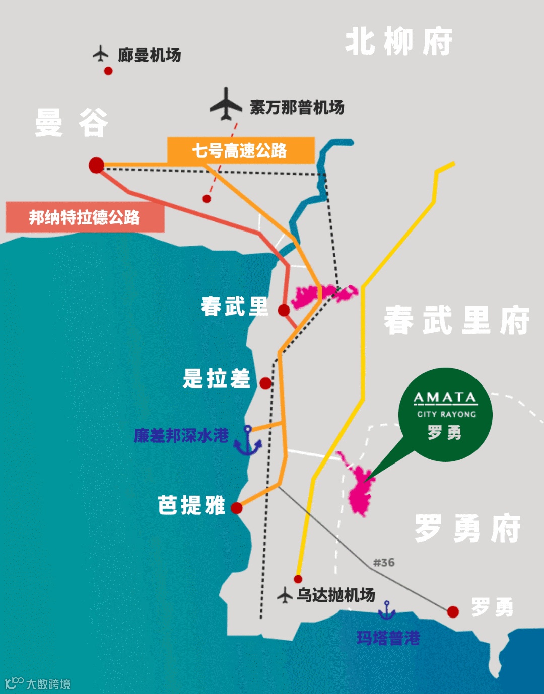 水陆空全方位交通 - 园区位于罗勇府331号高速公路旁,周边水、陆、空立体交通网络十分发达,距离泰国最大的深水港廉差邦港仅27公里,非常适 合加工转口型企业。