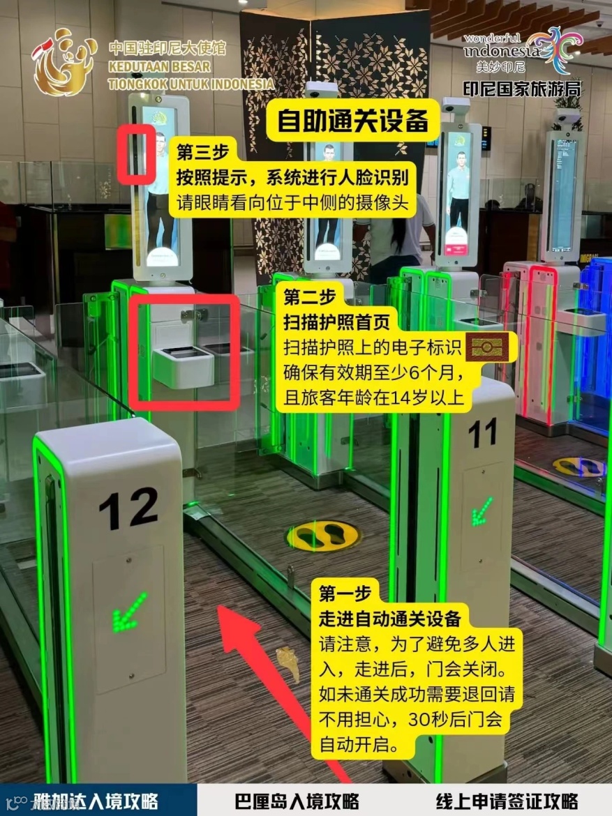 通过移民局官网(evisa.imigrasi.go.id)申请了有效电子签证的旅客,以及已持有印尼有限或永久居留许可(ITAS/ITAP)的外籍人士,均可以使用自助通关设备入境。不过,如持有新办工作签证、外交签证,需要入境章用于申请居留许可的人士,仍须使用人工查验通道。