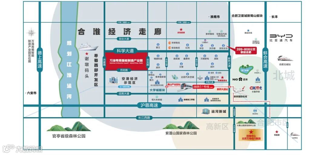 【交通物流】:享受合肥区位、寿县用工及物流成本,江淮运河码头、新桥机场、德上高速、沪陕高速、机场高速、蚌合高速、S1地铁、城市公交、合六城际铁路