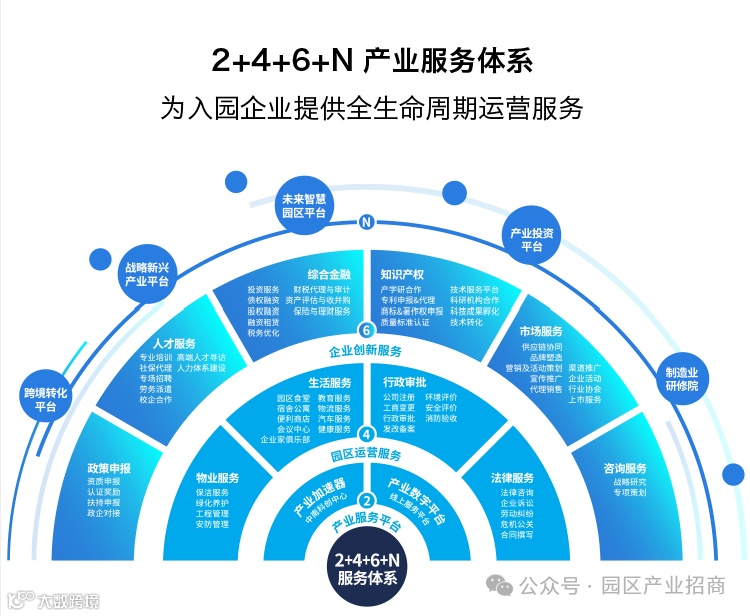 为入园企业提供“2+4+6+N”全生命周期产业服务,打造全产业链的服务生态圈。以2大产业服务平台为载体,4大园区运营服务为基础,6大企业创新服务为特色,联动N个特色服务平台,为企业提供标准化和定制化服务,助力企业发展。