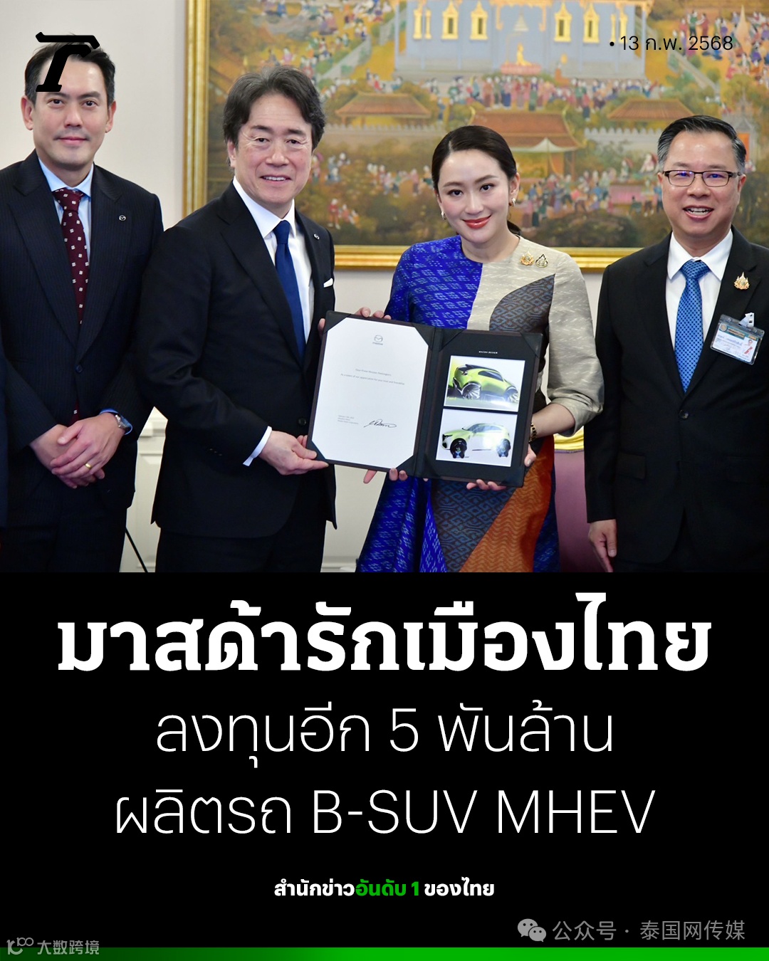 2025年2月13日,泰国投资促进委员会(BOI)秘书长纳立先生透露,日本汽车制造商马自达首席执行官毛笼胜弘于当天前往泰国政府大楼礼节性拜会了总理佩通坦,双方就进一步的投资合作事宜进行交流和讨论。