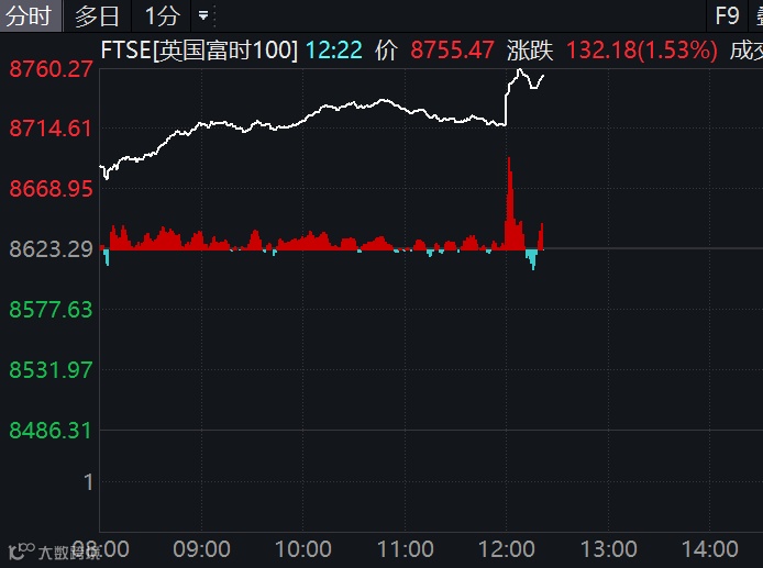 降息的消息公布后,英国股市大幅拉升,英国富时100指数涨幅扩大至1.5%,再创历史新高。