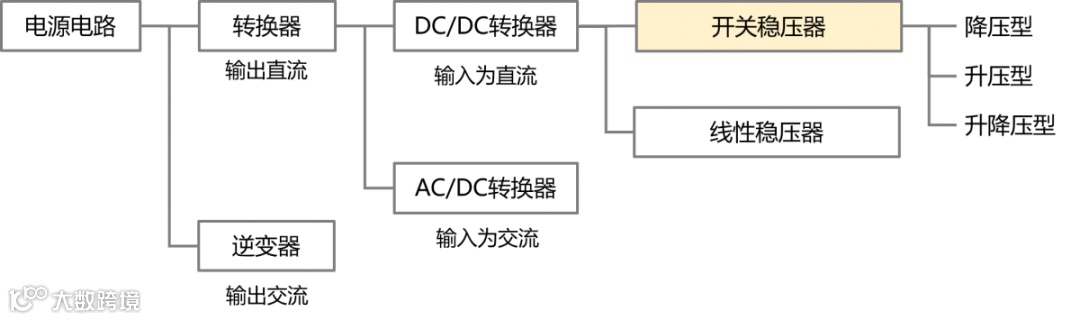 开关式稳压器的自由度极高,已被设计出各种电路构成并投入实用。若只着眼于输入电压和输出电压的关系,则可如下所示基本上将开关式稳压器分类为3类。