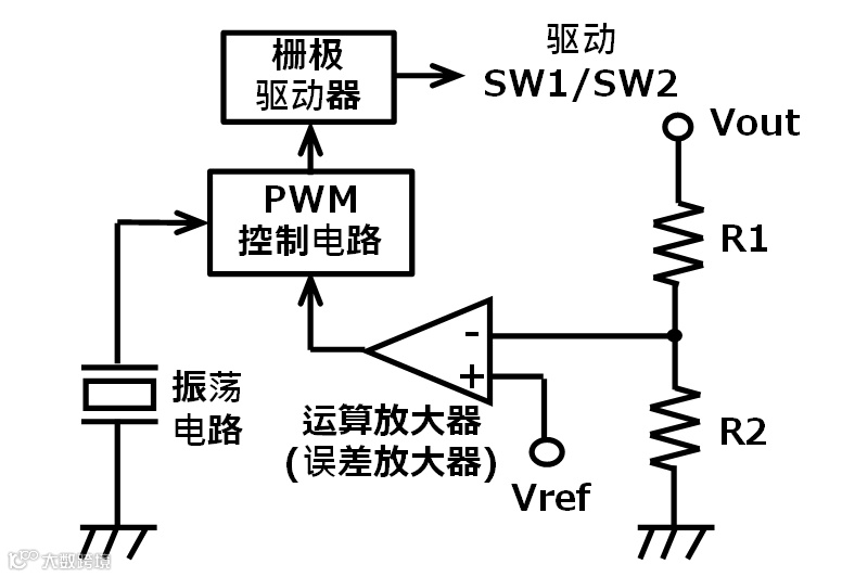 振荡电路输出开关动作所需的恒定频率的信号。开关频率一般处于数十KHz至数MHz的范围,譬如在汽车应用中,为了预防与无线电频带的干涉,将其设定为2MHz前后。为了能够根据系统灵活地设定最佳的开关频率,大多数情况下采用电压控制振荡器电路。