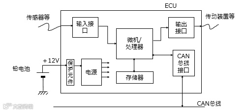 ECU的大致构成如图1所示。具体细节取决于所负责的功能,但大致上是由用来处理来自传感器等数字和模拟信号的输入接口、用来驱动传动装置和灯等的输出接口、用来与其他ECU交换信息的CAN总线等的总线接口、用来负责控制的微机或专用处理器、用来存储控制程序和数据的存储器、以及电源电路和保护元件构成。