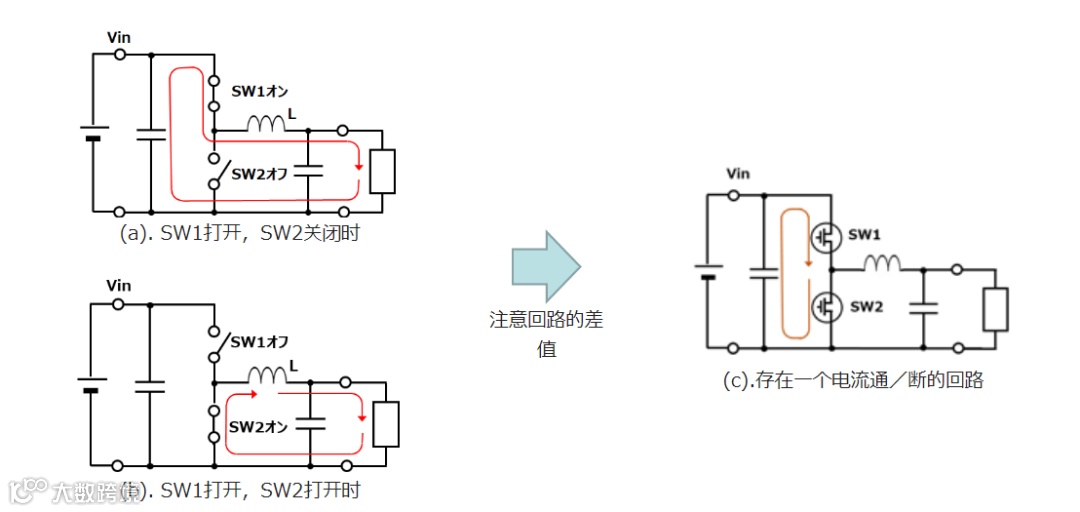 图4. 原理上在开关电源中存在的电流回路的模式图