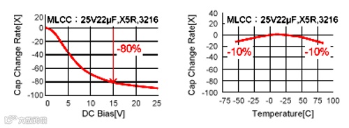 譬如,常用于开关电源的MLCC(多层陶瓷电容器),众所周知会由于温度和DC偏压而导致电容下降(图2)。