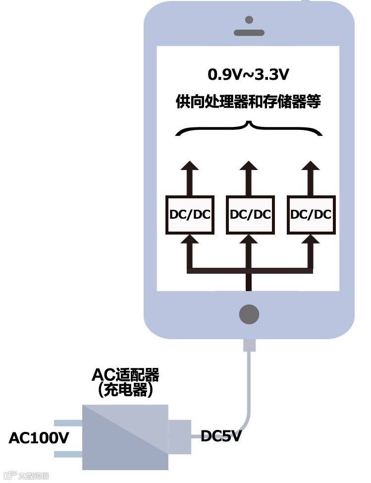要使构成设备的电子电路或半导体元器件正常动作,必须稳定地供给由规格确定的电压和电流。发挥该作用的则是电源电路。我们周围的智能手机的AC适配器(充电器)也是一种电源电路。当然,智能手机内部也安装有许多电源电路,供给处理器、存储器和显示器元件所需的电压和电流(图1)。