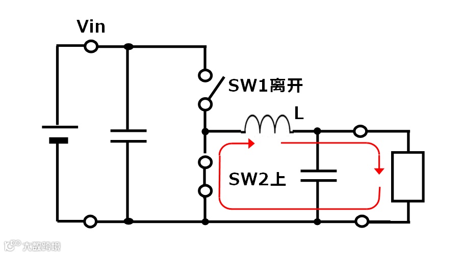 其次是开关元件SW1处于OFF,开关元件SW2处于ON的状态。此时的等效电路如图2(b)所示。输入电压Vin被从电路断开,取而代之,输出电感器L则释放出先前蓄积的能量以供向负荷。