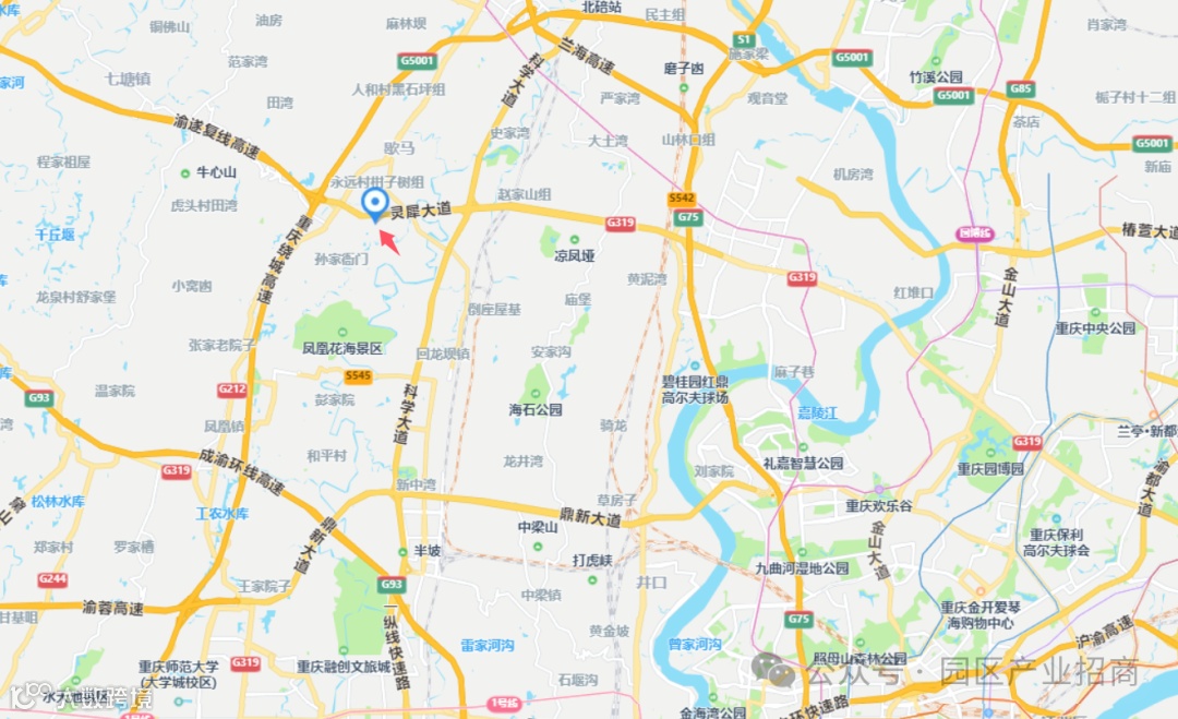 项目位于重庆高新区歇马组团,重庆一路向西政策导向范围内,西接大学城、东临蔡家与蔡家组团仅有隧道之隔。同时经绕城高速西南方向衔接大学城片区。距离江北机场约28公里重庆北站22公里、重庆西站约25公里。