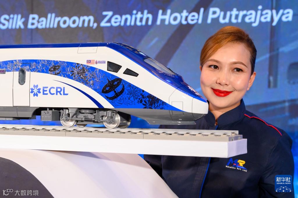 ▲ 12月18日,在马来西亚普特拉贾亚,模特与新的动车组模型合影。新华社发(张纹综摄)