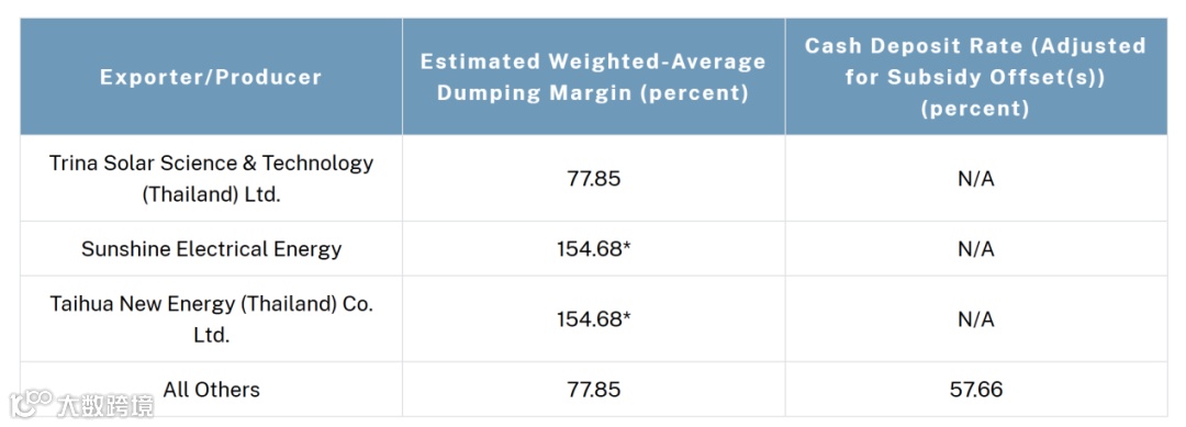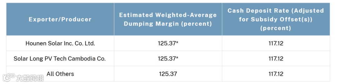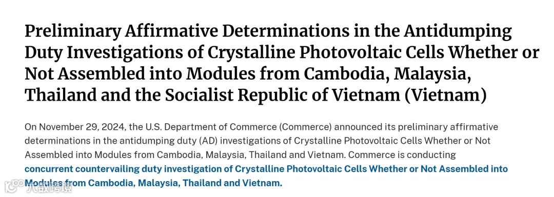 2024年4月,美国太阳能制造贸易联盟委员会向美国商务部提交“双反调查”(反倾销、反补贴)申请。5月,美国商务部启动对东南亚四国的“双反调查”。反补贴初裁结果早前已公布,相较最新公布的反倾销税率,反补贴税率较低。国内主要光伏企业的反补贴税率为0.81%—8.25%。