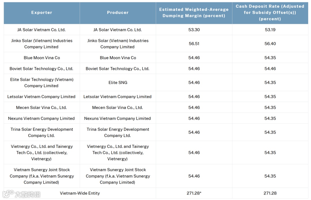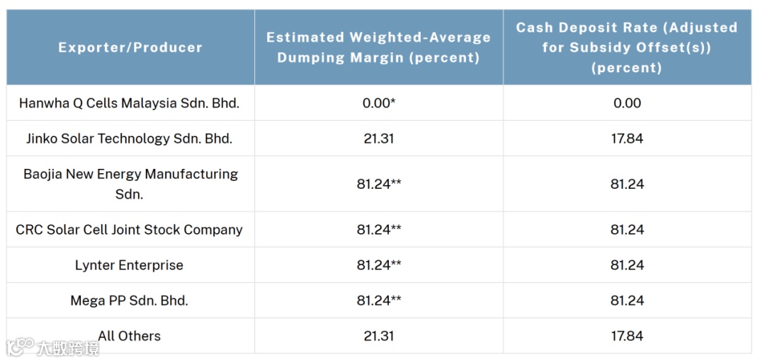 从此次发布的公告看,美国商务部对东南亚四国的电池光伏企业反倾销税率范围在0—271.28%。其中,韩华Hanwha Qcell马来西亚反倾销税率为0,Vietnam-Wide Entity越南反倾销税率为271.28%。