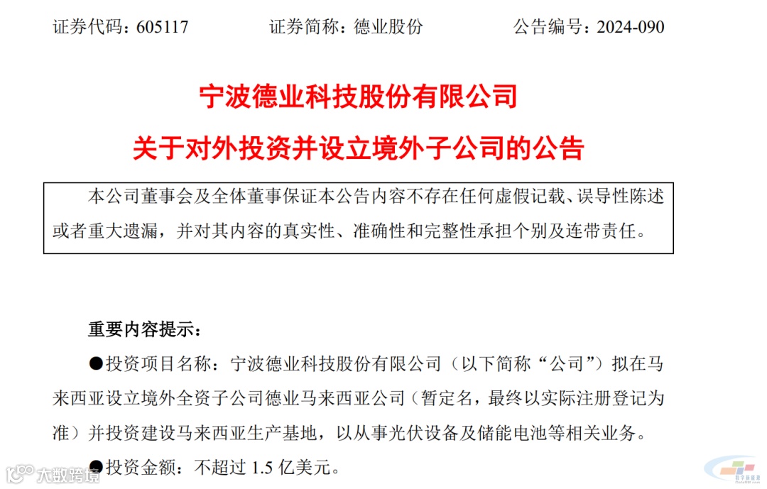 12月16日,德业股份发布关于对外投资并设立境外子公司的公告,拟在马来西亚设立境外全资子公司德业马来西亚公司(暂定名),并投资建设马来西亚生产基地,以从事光伏设备及储能电池等相关业务。
