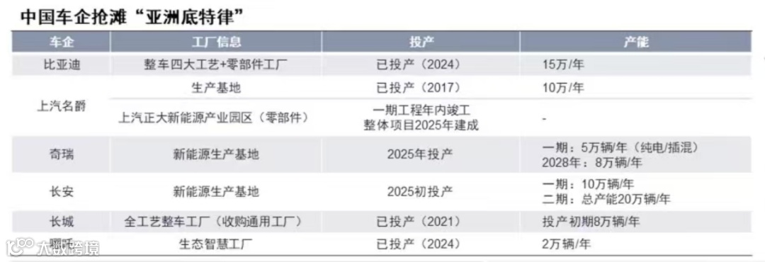 今年7月,比亚迪和埃安的泰国工厂先后竣工投产。目前,上汽名爵、长城、长安、比亚迪、奇瑞、哪吒等中国车企已在泰国建厂,使其成为中国车企产能出海的主要目的地,不需要多长时间,中国将取代日本,在泰国拥有最多的汽车工厂。