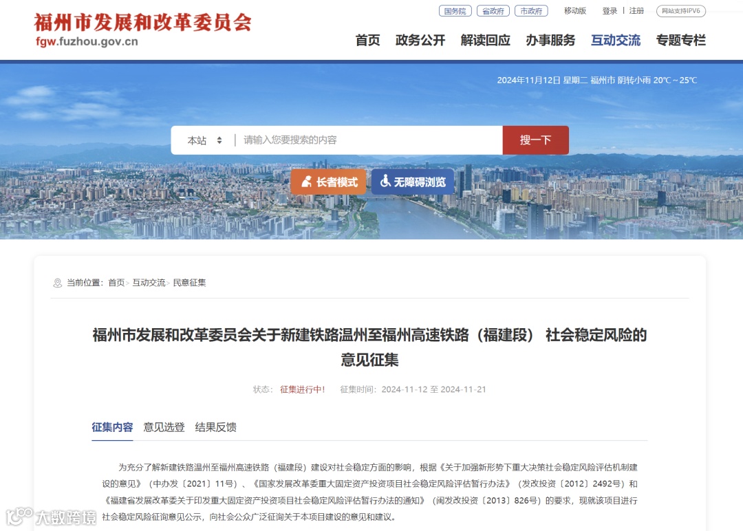 11月12日,福州市发展和改革委员会发布了《关于新建铁路温州至福州高速铁路(福建段) 社会稳定风险的意见征集》公告。