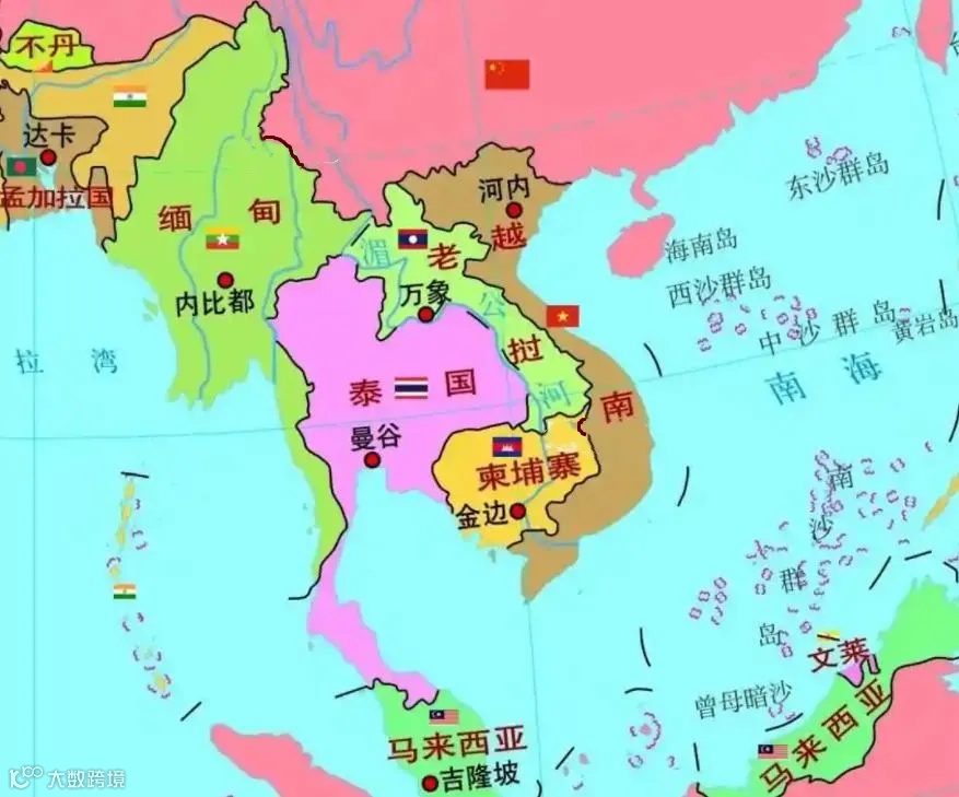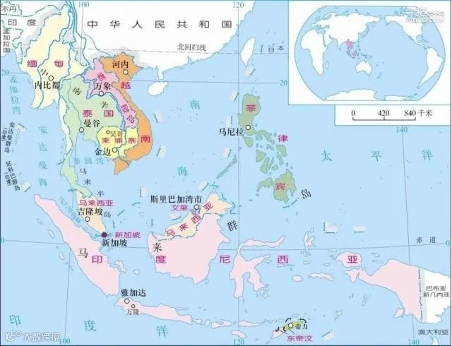 东南亚(Southeast Asia,缩写SEA),它位于亚洲东南部,包括中南半岛和马来群岛两大部分。其中,马来群岛散布在太平洋和印度洋之间的广阔海域,是世界最大的群岛,共有两万多个岛屿,分属印度尼西亚、马来西亚、东帝汶、文莱和菲律宾等国。
