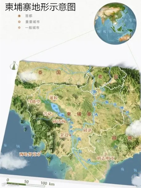 源自中国青海的澜沧江出国之后,更名为“湄公河”,以2711公里的长度,成为东南亚第一大河。湄公河从北向南穿过柬埔寨境内约500公里。柬埔寨境内的湄公河,及其支流的周围地区,地势低洼,最高处海拔只有32米。