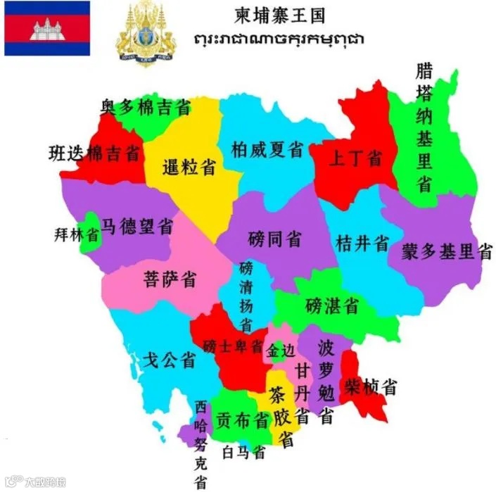 柬埔寨(Cambodia),旧称高棉,全称是柬埔寨王国(The Kingdom of Cambodia),位于东南亚[注1]中南半岛[注2]的西南部;西部及西北部与泰国接壤,东北部与老挝交界,东部及东南部与越南毗邻,西南部则面向泰国湾(暹罗湾),海岸线长约460公里;高棉语[注3]和英语是官方语言,在城市和受教育人口中,法语也被广泛使用;全国共分为24个省和1个直辖市(金边市),首都金边(Phnom Penh)。
