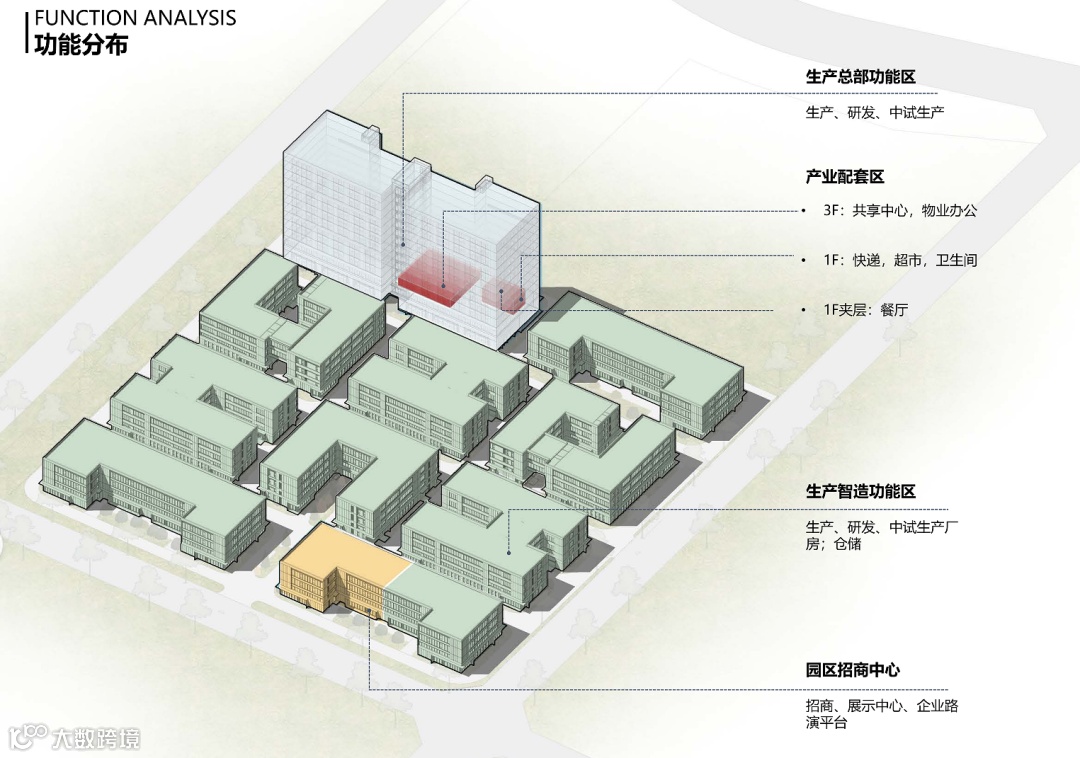 ①高科技绿色生态产业公园社区,产品立面工业化设计与开放的生态社区相融合,满足不同生产场景及社交环境。