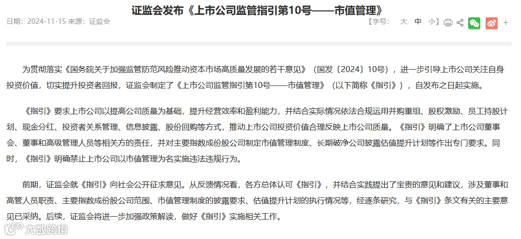 11月15日,证监会表示,为贯彻落实《国务院关于加强监管防范风险推动资本市场高质量发展的若干意见》(国发〔2024〕10号),进一步引导上市公司关注自身投资价值,切实提升投资者回报,证监会制定了《上市公司监管指引第10号——市值管理》(下称“《指引》”),并自发布之日起实施。