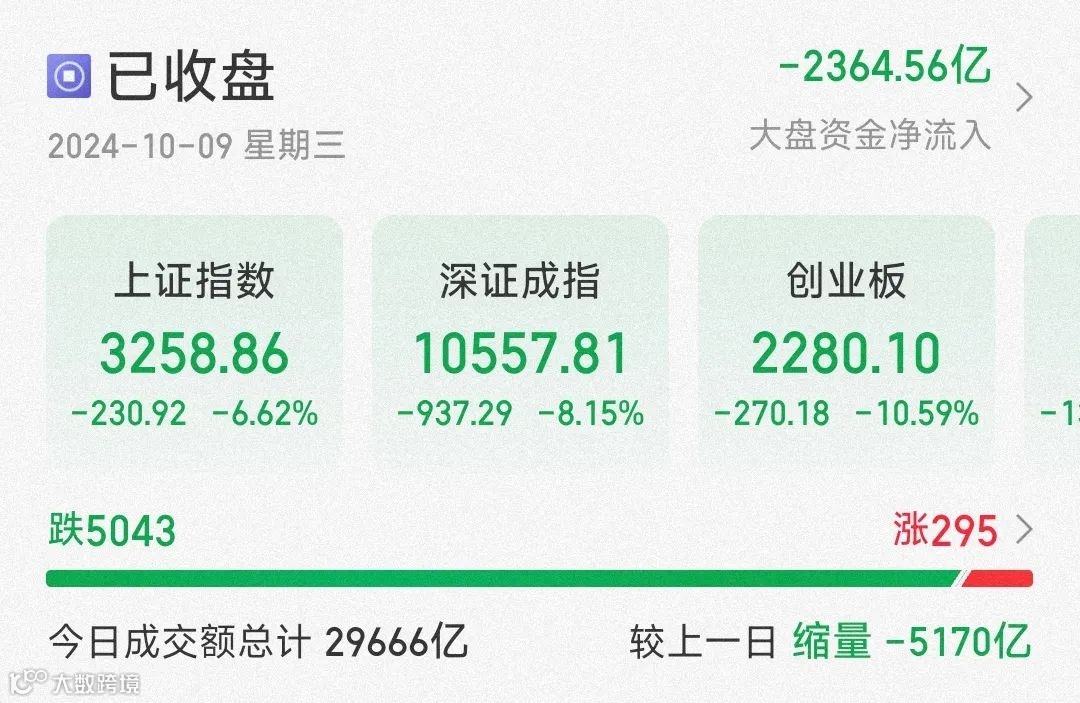 在连续6个交易日大涨后,10月9日A股迎来调整。经过昨日天量的成交后,今日A股低开低走,全市场超5000只个股下跌。截至收盘,沪指跌6.62%,深成指跌8.15%,创业板指跌10.59%,北证50指数跌12.11%。全市成交29666亿元,较上日缩量5170亿元。 -
