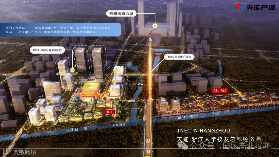 项目位于浙江大学校友总部经济园二期,杭州高铁西站门户直线距离800米;地铁上盖,园区西北角为3号线龙舟路站,一站直达杭州西站,换乘机场快线后45分钟直达萧山机场,交通便利!