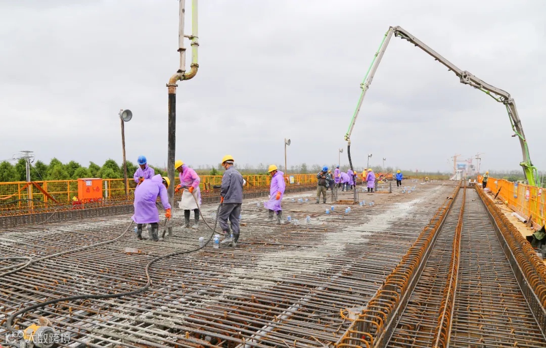 今天上午8时10分,经过20多个小时的连续作业,由中铁大桥局承建的沪渝蓉高铁V标崇明特大桥跨启东市启隆镇永兴公路540—543号墩连续梁浇筑完成。