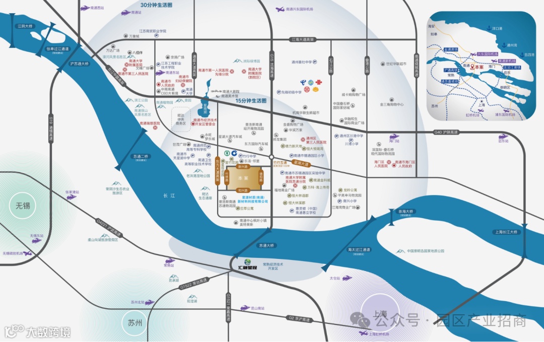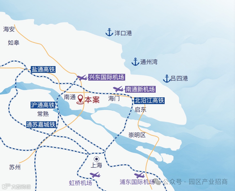 项目车程30分钟内含G15沈海高速、G40沪陕高速、南通汽车东站、南通火车站、南通兴东机场、南通新机场等交通路网,快速连接长三角直达上海、苏州,15分钟可达南通CBD及市政府,纵横产业发展主场。