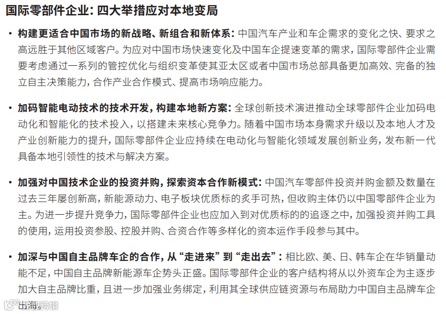 中国企业的出海需要依靠高附加值的出口商品。真正的全球化还要建立或收购海外资产,而不只是向海外出口货物。我们发现电动汽 车产业链上的中国企业已经开始了这样的新型全球化。从一方面说,这可能会给一些外国品牌在自己的国内市场上带来挑战。但从另一个方面来看,这也给一些外国企业带来机会,帮助他们通过新的伙伴关系获得最新技术,迎来新的投资。在汽车和材料与加工行业的一些最新事件也反映了中国企业的新全球化模式。