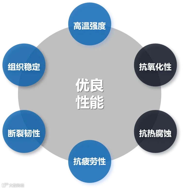 相比普通金属,高温合金在复杂工作环境下的性能优异:1)高温强度;2)抗氧化性;3)抗热腐蚀;4)抗疲劳性;5)断裂韧性;6)内部组织稳定,使用可靠。