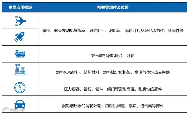 经过数十年发展,我国在高温合金的研究和生产上取得了巨大的进步,基本形成了牌号齐全的高温合金体系,并形成了一定的产能规模。其在航空航天、燃气轮机、汽车等领域均为核心应用材料。