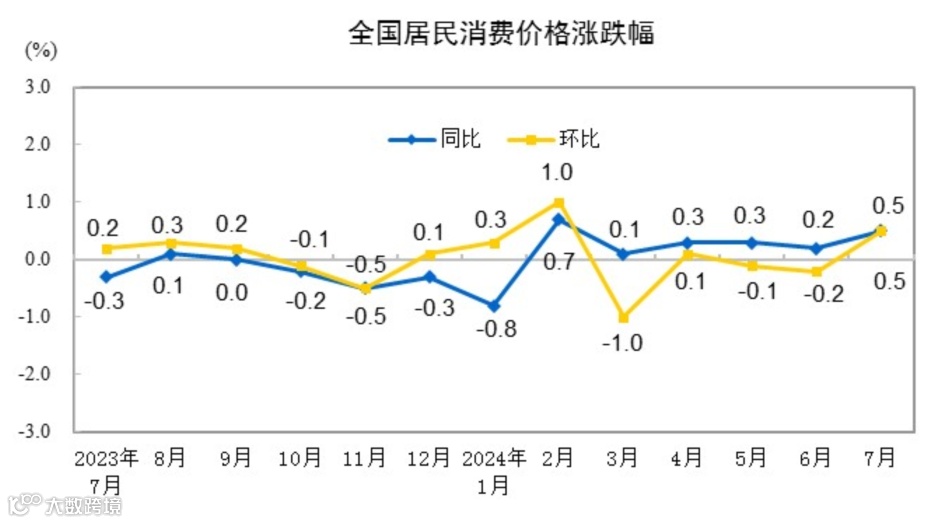 国家统计局8月9日发布数据显示,7月份,全国居民消费价格同比上涨0.5%,环比上涨0.5%。全国工业生产者出厂价格同比下降0.8%,环比下降0.2%。