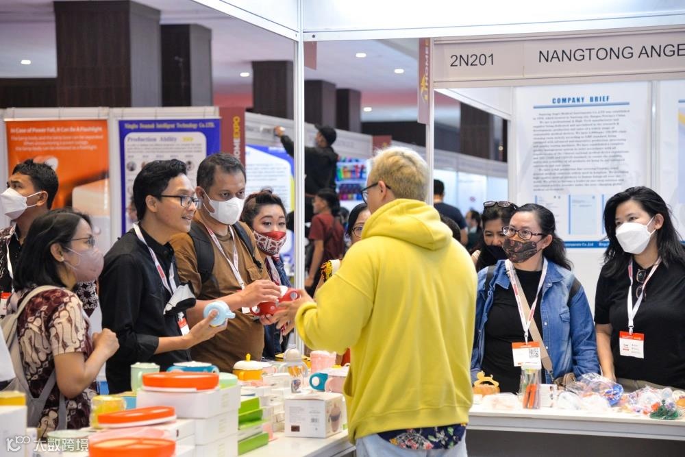 2023年3月16日,雅加达国际会展中心,参会者在第三届中国(印尼)贸易博览会上了解商品