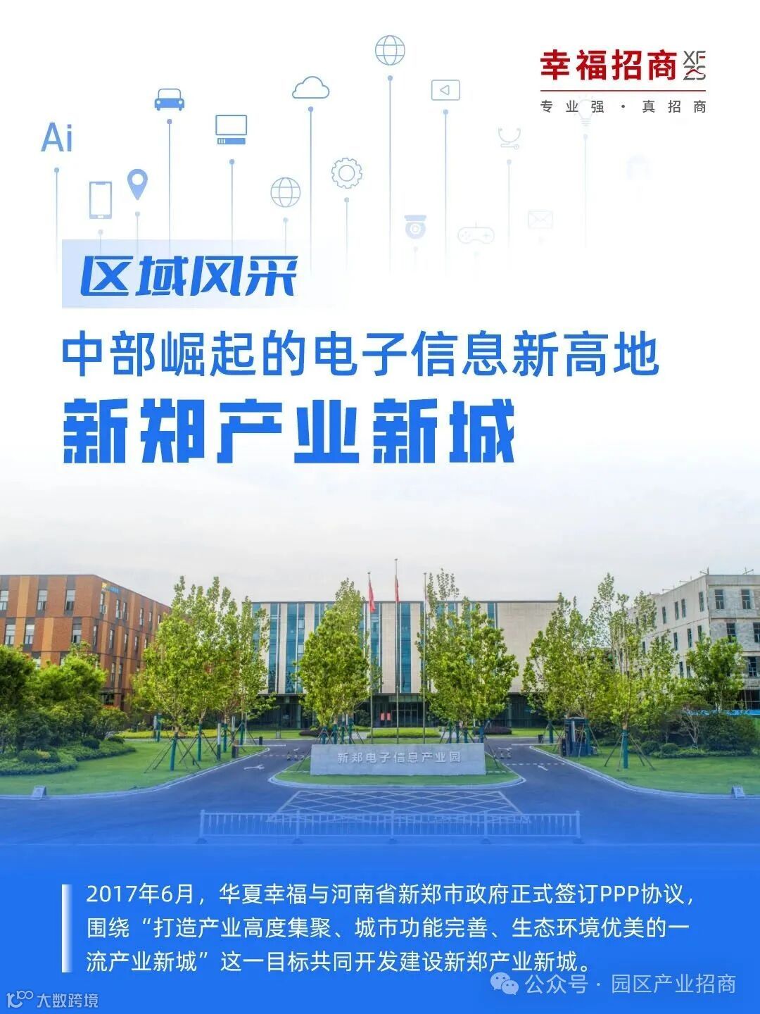 2017年6月,华夏幸福与河南省新郑市政府正式签订PPP协议,共同开发建设新郑产业新城,致力于将其打造成“中原经济带产业中枢,国际城市群效率园区”。自签约以来,新郑产业新城加速发展,基础设施日趋成熟,城市功能日臻完善,产业集群集聚持续加速。