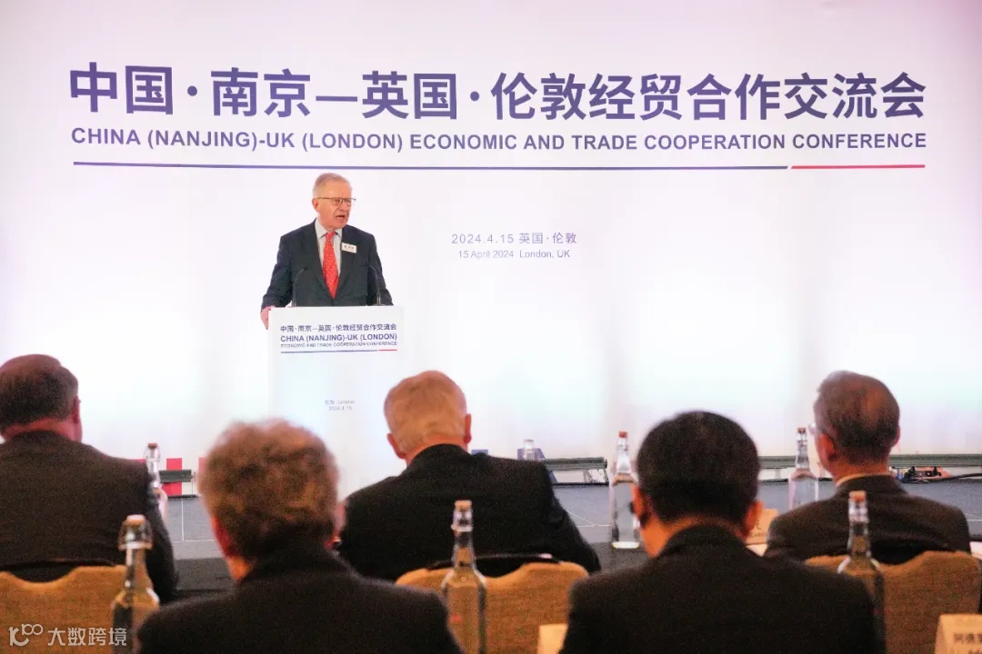 中国·南京—英国·伦敦经贸合作交流会现场,英中贸易协会主席古沛勤爵士致辞。