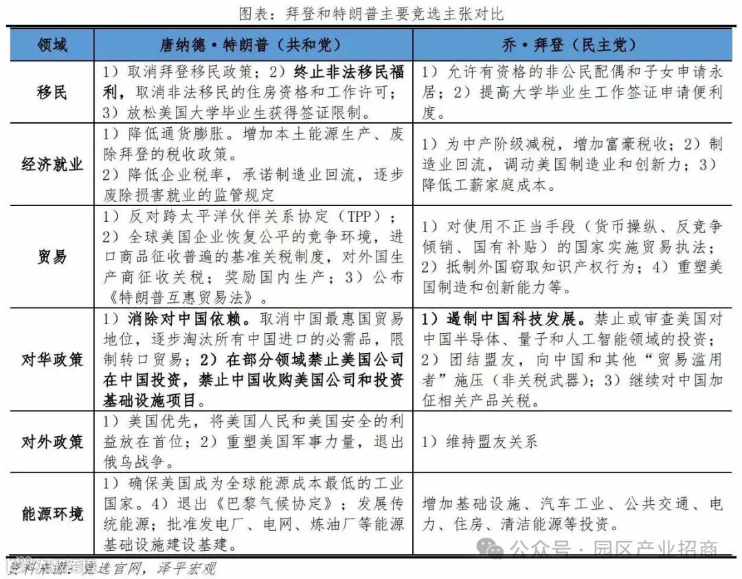 特朗普主张制造业回流,为此采取对外加征关税、对内减税的措施。他支持传统能源,主张退出战争,并拒绝非法移民,具有明显的右倾民粹主义色彩。他还打算向全球输出其政策,一视同仁征收“全球基本关税”,并且对部分国家进一步提高关税。