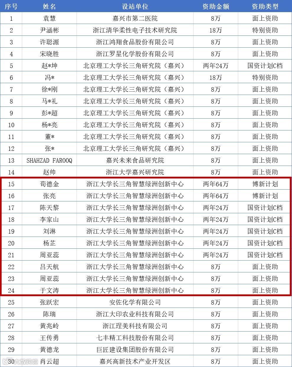 全国博士后管委会办公室和中国博士后科学基金会近日公布2024年度博士后创新人才支持计划、国家资助博士后研究人员计划(B、C档)、中国博士后科学基金第17批特别资助及第75批面上资助名单。嘉善共有10名博士后成功入选,占全市入选人数的1/3,列全市第一,资助金额共计272万元,占全市总资助金额的58.1%,成功实现了博士后获“国家级”资助项目的全覆盖,入选人数、入选项目、资助金额均创历史新高,实现新突破。