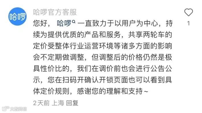 对此,哈啰官方客服回应表示,共享两轮车的定价受整体行业运营环境等诸多方面的影响会不定期做调整,但调整后的价格仍然是极具性价比的,哈啰在调价前会进行公告公示,用户在扫码确认开锁页面也可以看到具体定价规则。