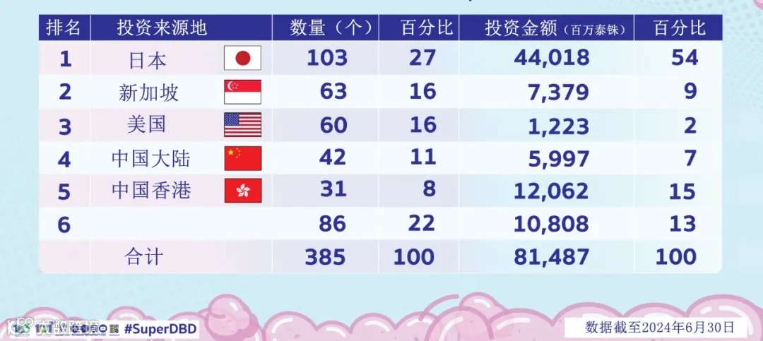 投资者来自:日本:40家,投资52.25亿泰铢;中国大陆:21家,投资19.18亿泰铢;中国香港:12家,投资50.08亿泰铢;其他国家和地区:43家,投资88.83亿泰铢。