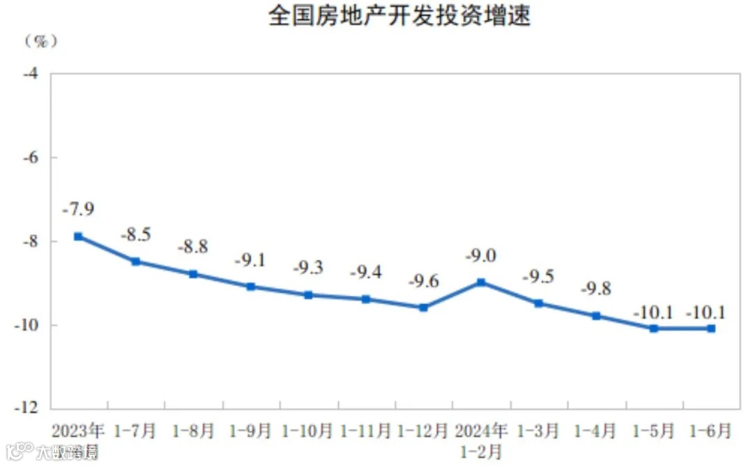 据国家统计局,1-6月份,全国房地产开发投资52529亿元,同比下降10.1%;其中,住宅投资39883亿元,下降10.4%。房地产开发企业房屋施工面积696818万平方米,同比下降12.0%。其中,住宅施工面积487437万平方米,下降12.5%。房屋新开工面积38023万平方米,下降23.7%。其中,住宅新开工面积27748万平方米,下降23.6%。房屋竣工面积26519万平方米,下降21.8%。其中,住宅竣工面积19259万平方米,下降21.7%。