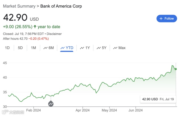过去一个月,美国银行股价上涨了7.9%,今年至今累计上涨26.55%。