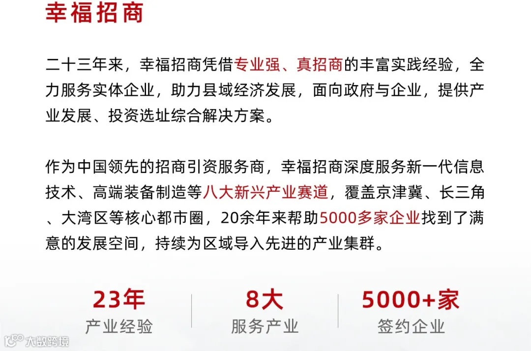 幸福招商·面向全国广大县域经济源地接受招商引资服务委托, 服务制造业企业在全国各开发区落地并享受相关招商引资政策,厂房土地资源丰富、政策给力,已累计签约入园企业 3000余家,其中500强企业 33家,上市公司49家,国家高新技术企业 560余家,知名品牌 420余家,专精特新企业20家,外资企业 34家。