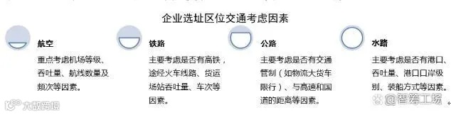 区位交通是一个地区或园区发展最根本的依托。交通运输便捷、通行能力强的地方往往成为企业区位选择的关注重点,这些交通运输便捷的地方具有发达的交通物流和通信网络技术的支持。除了城市或园区内道路通畅、道路等级、道路通行能力、交通设施建设情况以及该区域同外部区域的交通便捷性,还应考虑以下因素: