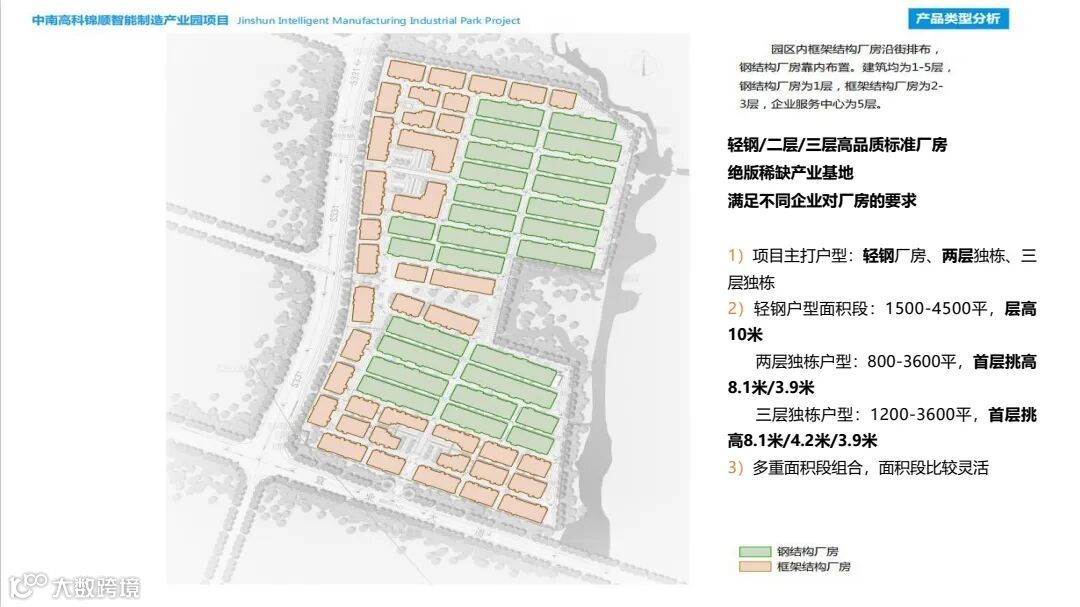 【层高】:纯一层轻钢高度10-11米,预留牛腿/ 两层独栋层高为8.1/3.9,三层为8.1/4.2/3.9,首层层高均在8.1米。