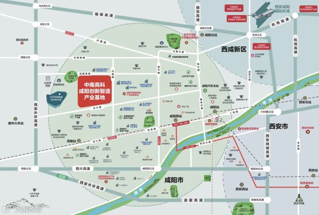 项目地处咸阳市秦都区,高速路网环绕(西安绕城、西兴高速、福银高速、银白高速),咸阳西站(地铁1号线终点站)直线距离仅3公里;